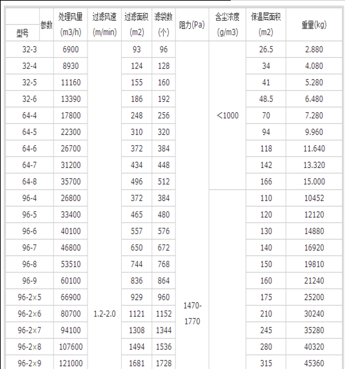 離線氣箱脈沖布袋除塵器型號表: