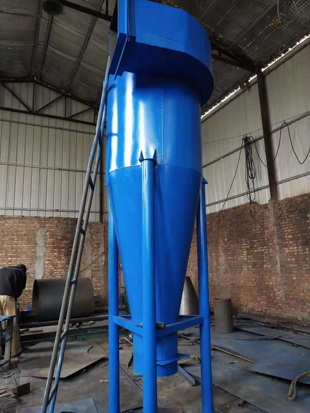 旋風除塵設備(Cyclone dust collector)是使含塵氣體產生高速旋轉運動,通過對塵粒施加離心力而使粒子從氣流中分離出來的除塵設備(Dust collector)。含塵氣體由裝在筒側且與之相切的進氣管切向進入筒體內,沿筒內壁旋轉。在同一平面上轉360°后,被后續進入的氣流擠壓而旋轉著向下,而后上氣流進入排氣管,塵粒在離心力的作用下甩向器壁,并在重力和向下旋轉的氣流的作用下落入灰倉。以凈化氣流于圓錐底部被迫轉向除塵器中心,在中心形成旋轉向上的氣流,由排氣管排出。